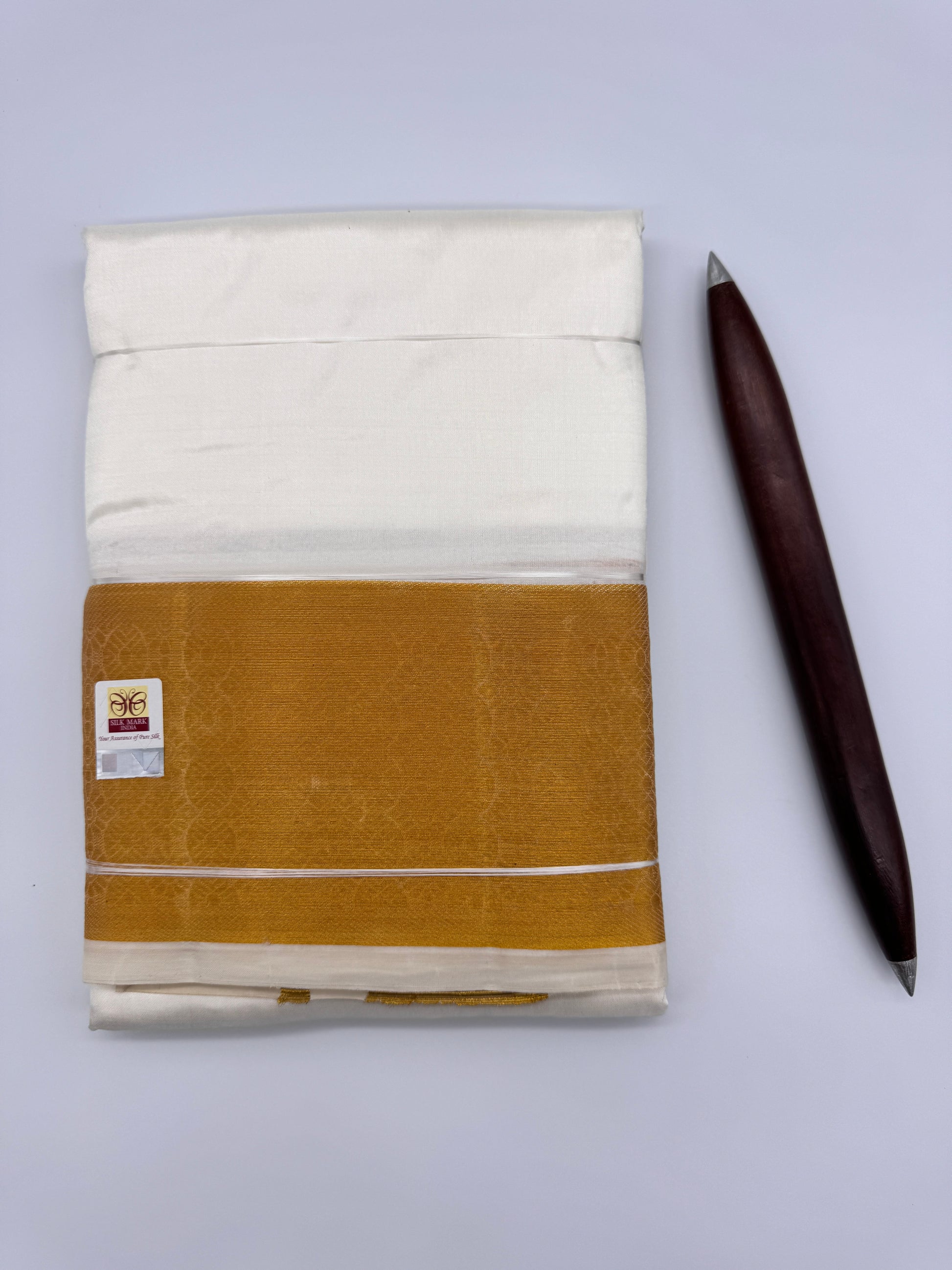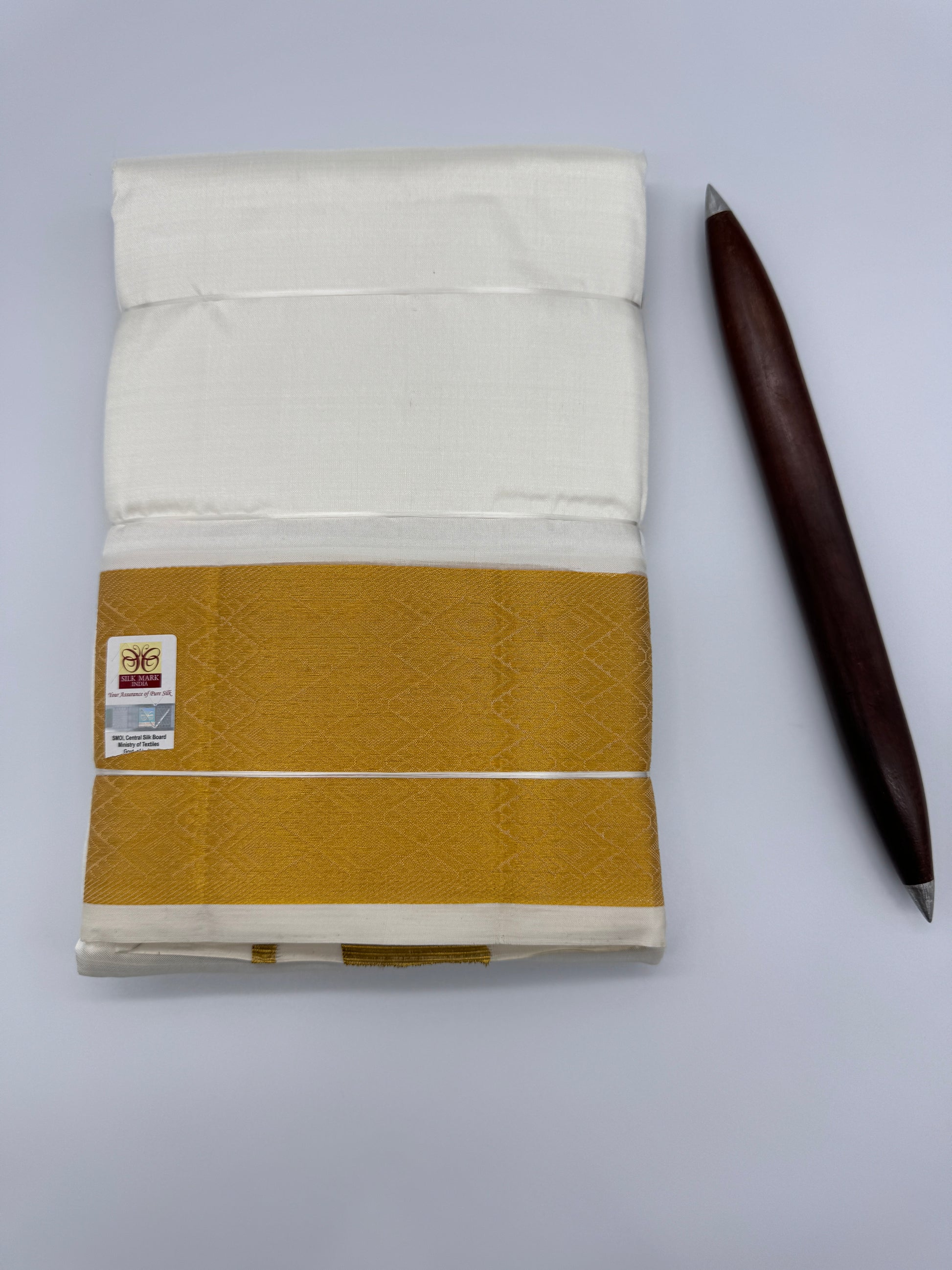 This veshti not only celebrates the rich heritage of traditional attire but also offers a comfortable and stylish option for modern wearers. The pure silk fabric ensures breathability and softness, making it suitable for all-day wear, while the cream color provides a neutral base that can be accessorized in multiple ways. Perfect for those who appreciate the fusion of tradition and contemporary style, our 4-Inch Traditional Border Pure Silk Veshti is a must-have addition to your wardrobe.