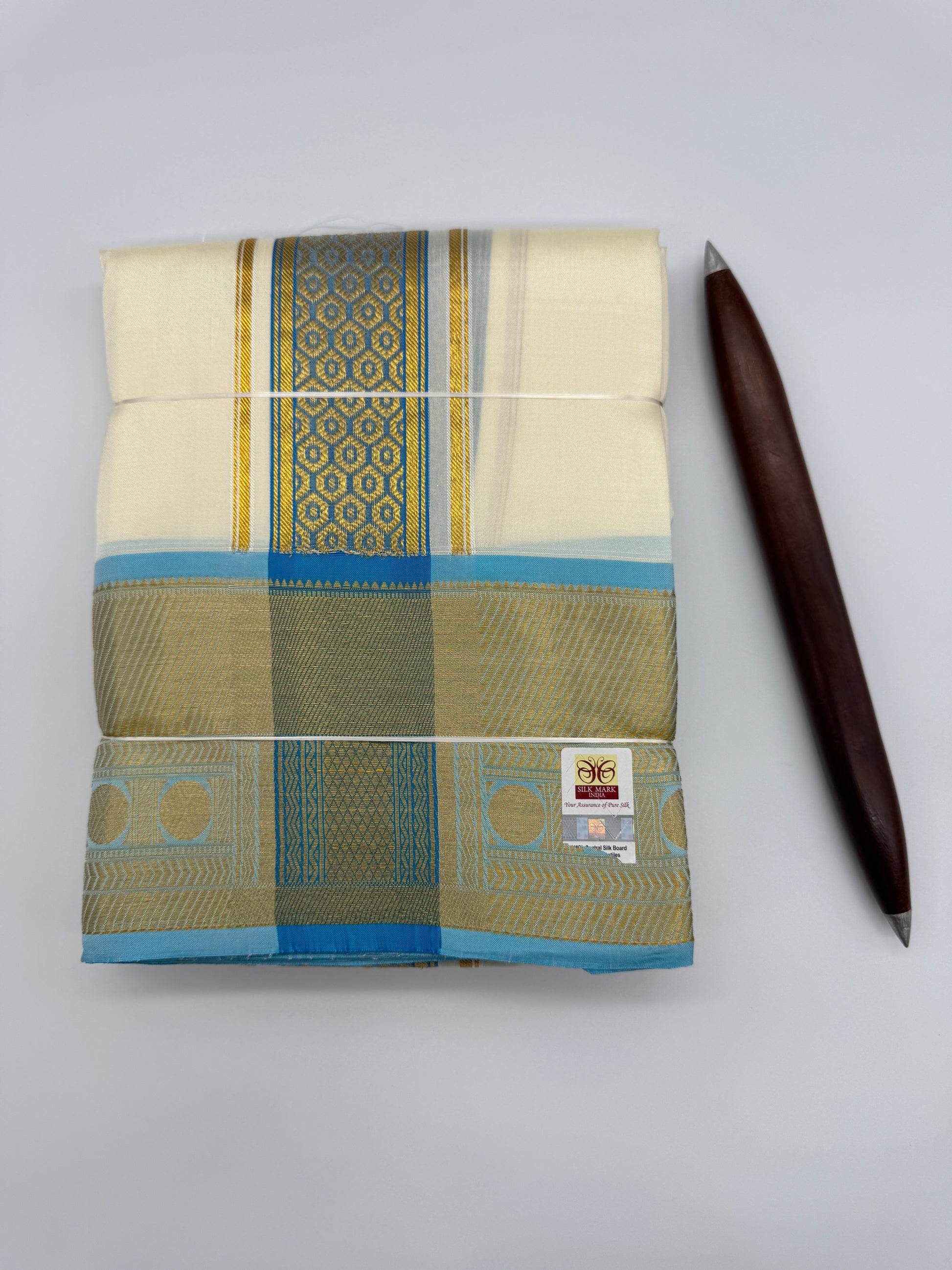 Experience the epitome of traditional elegance with our 4-Inch Traditional Border Pure Silk Veshti in a serene cream hue. Crafted with meticulous attention to detail, this veshti brings a touch of sophistication and timeless style to any wardrobe. Ideal for a variety of occasions, from weddings and religious ceremonies to casual gatherings, this pure silk veshti offers unmatched comfort and a luxurious feel.