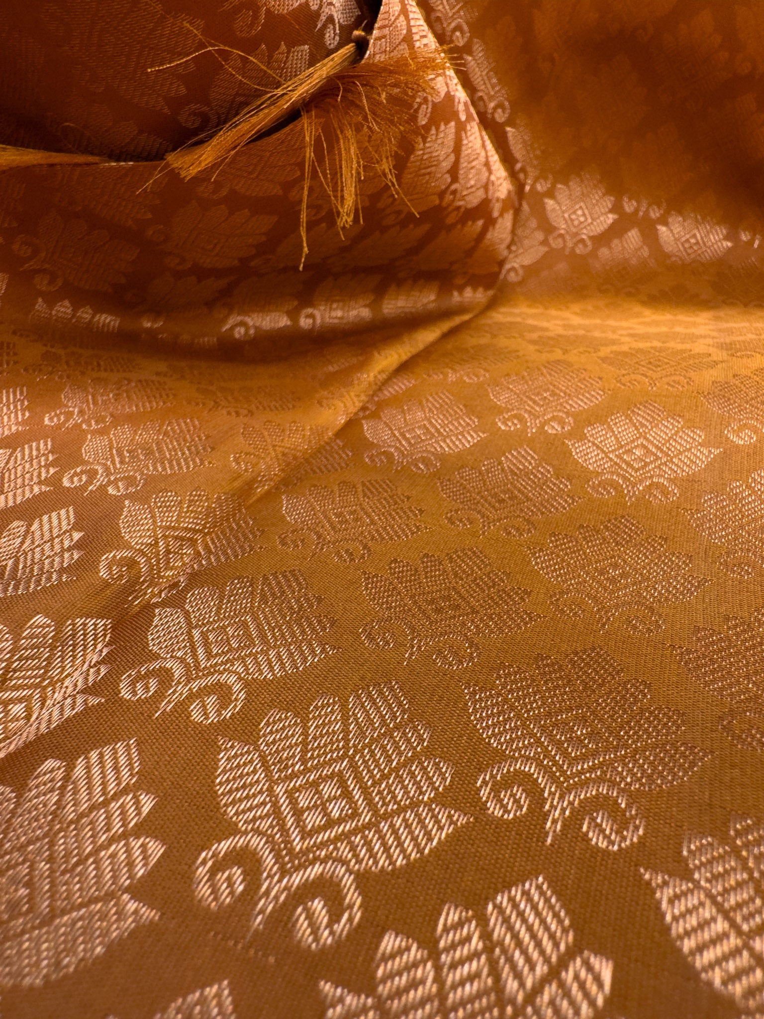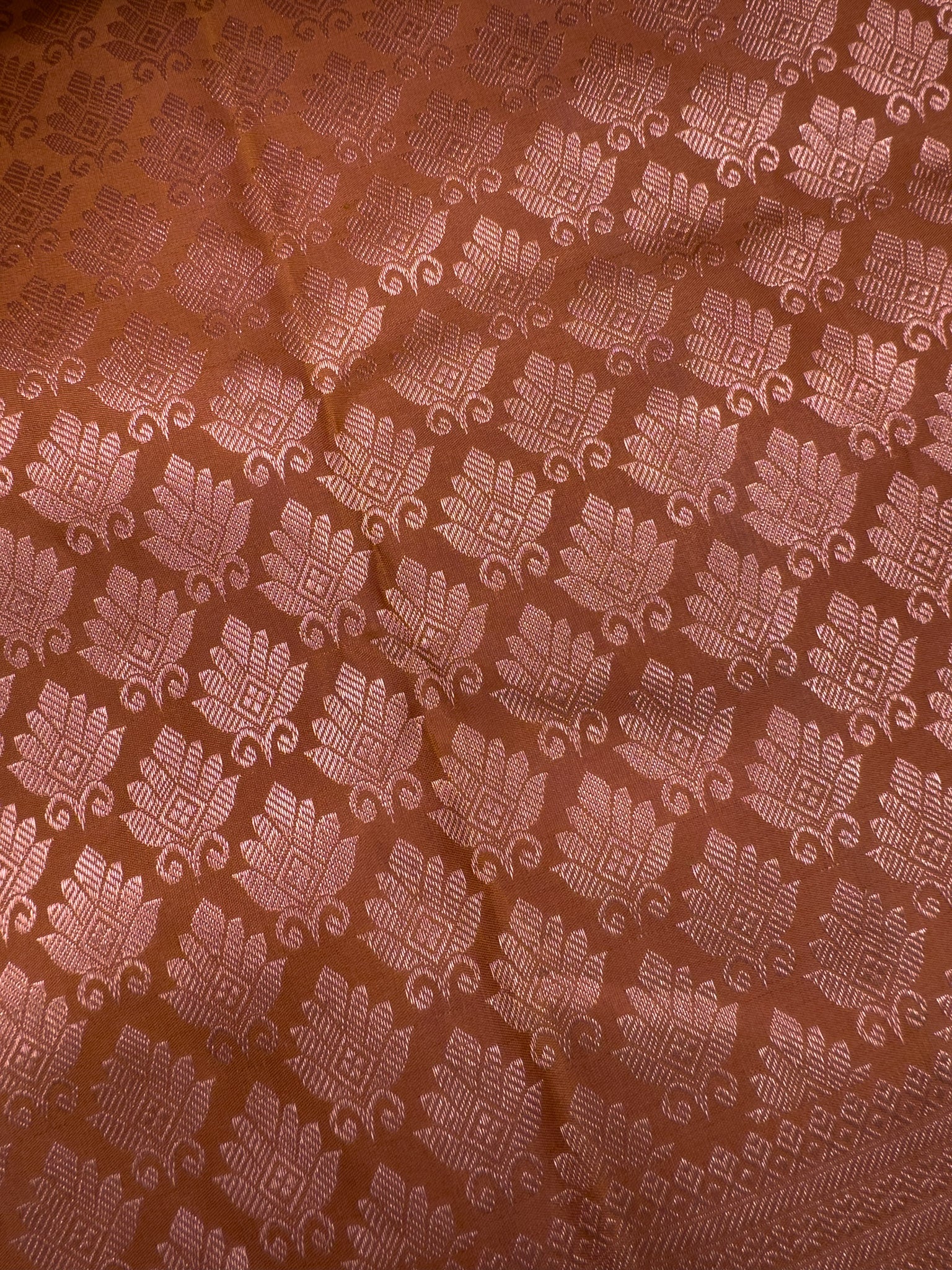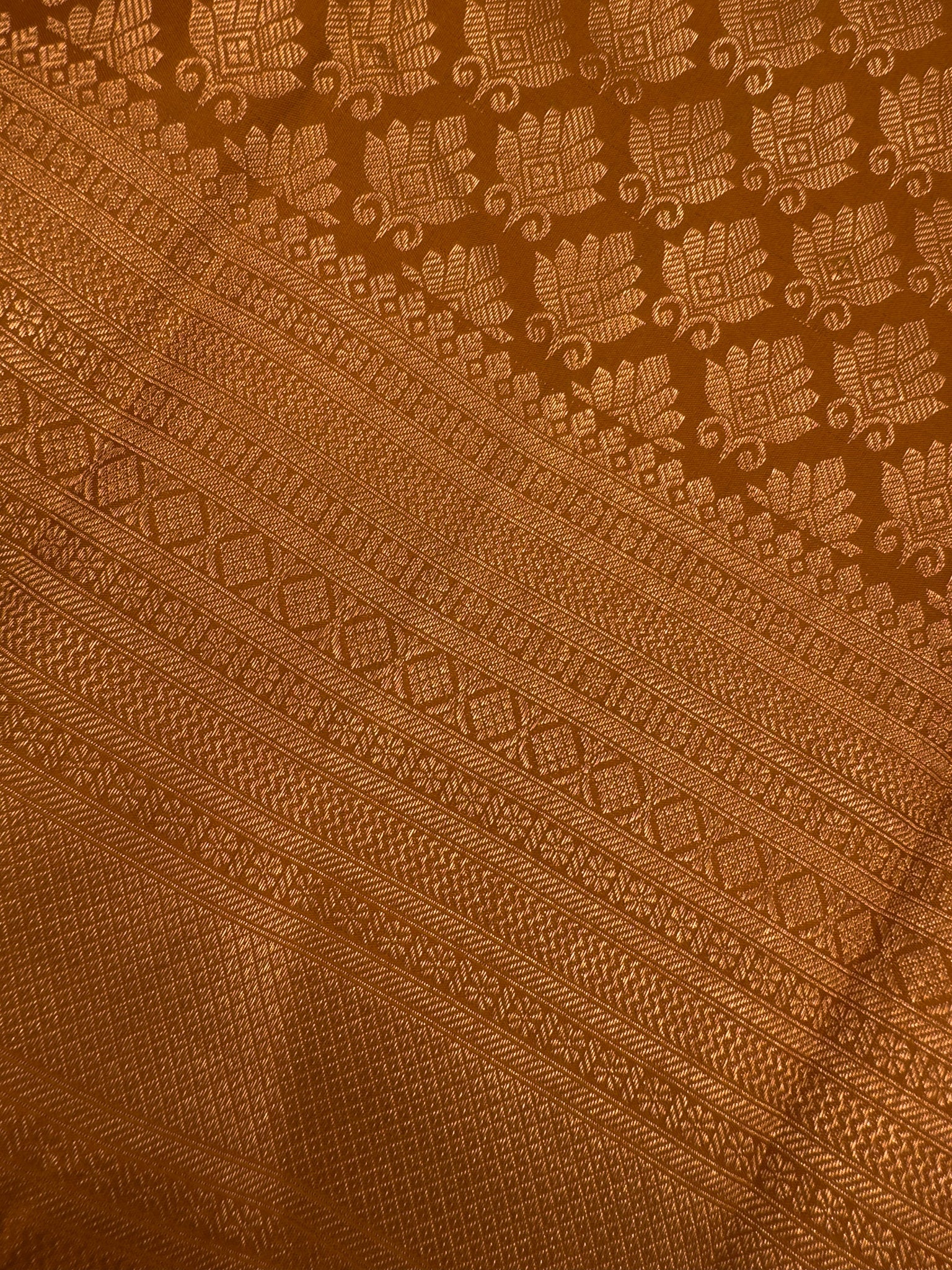 Embrace the luxury and heritage of Indian craftsmanship with our Burnt Orange Kanchipuram Silk Saree. Its mesmerizing gold zari work and vibrant color make it a must-have for those who appreciate the beauty of traditional attire.