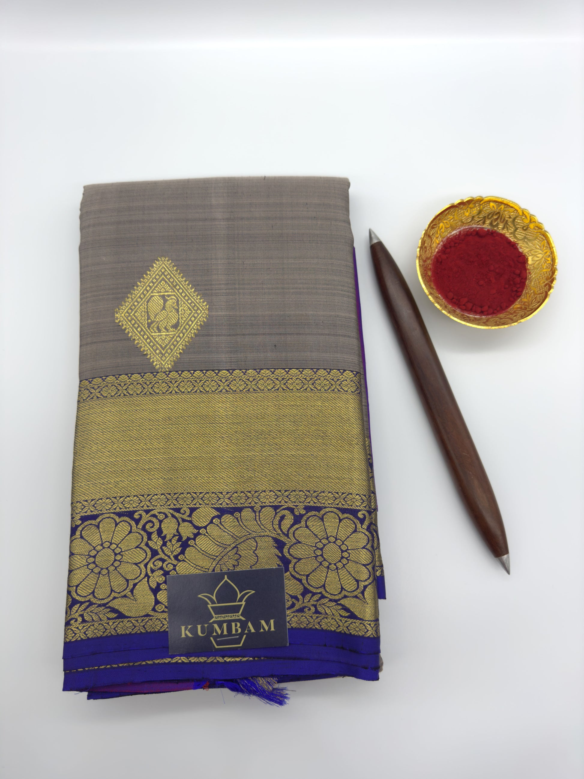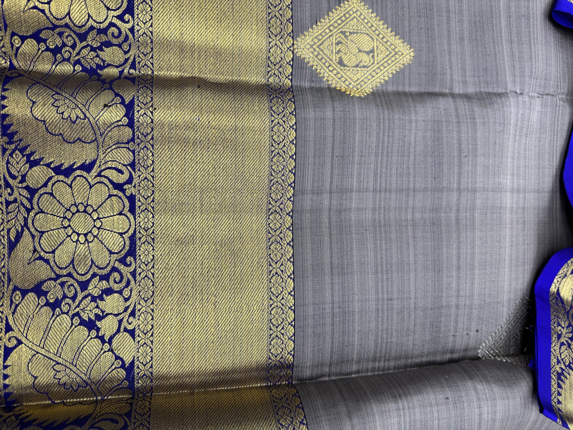 Immerse yourself in the luxurious drape of our Grey Kanchipuram Silk Saree, a masterpiece that blends traditional craftsmanship with contemporary elegance. This saree is meticulously crafted from high-quality silk, known for its durability and luster, ensuring that it remains a cherished part of your wardrobe for years to come. The saree features an exquisite contrast in gold zari work, adding a touch of glamour and sophistication to your ensemble.