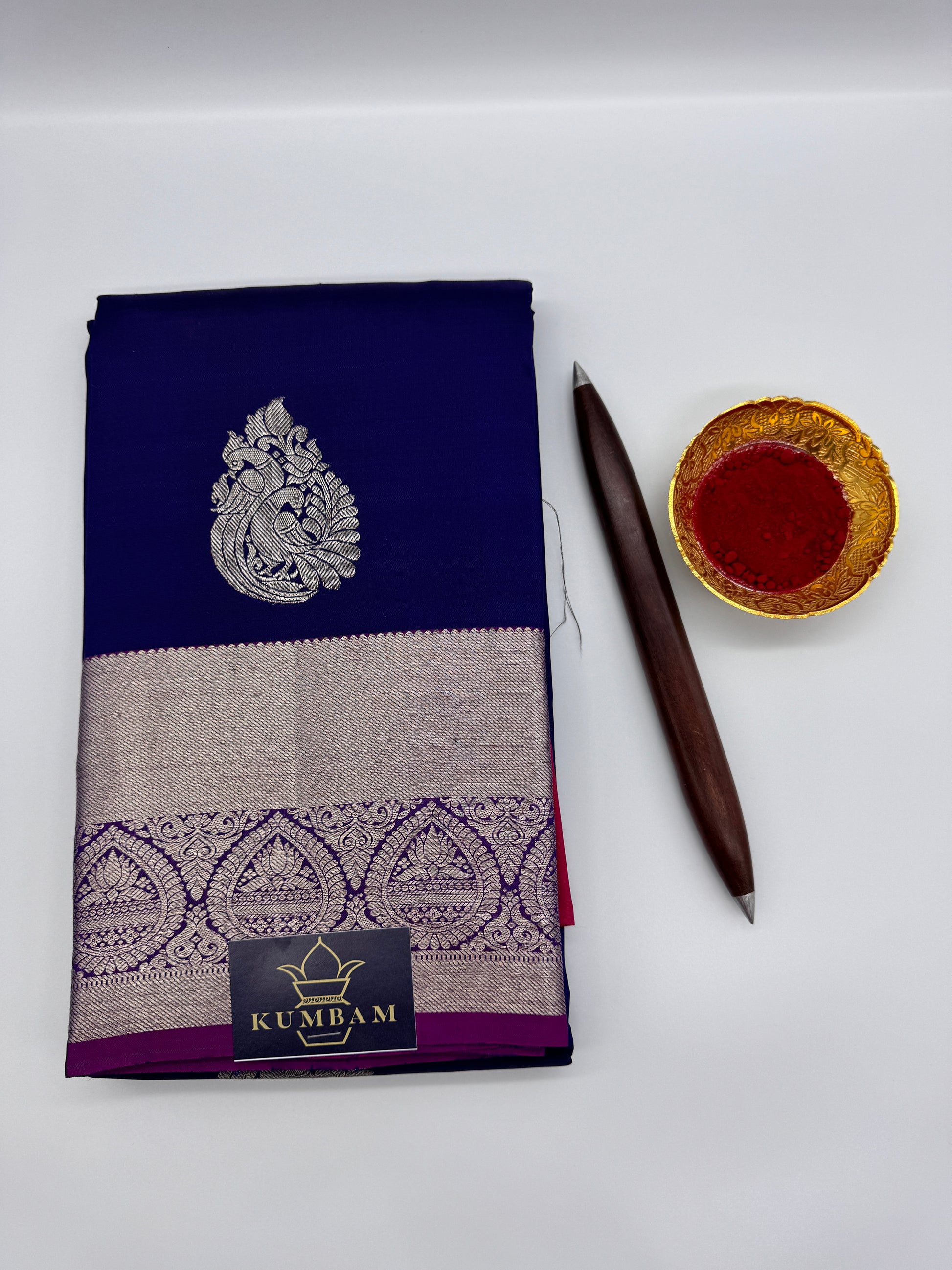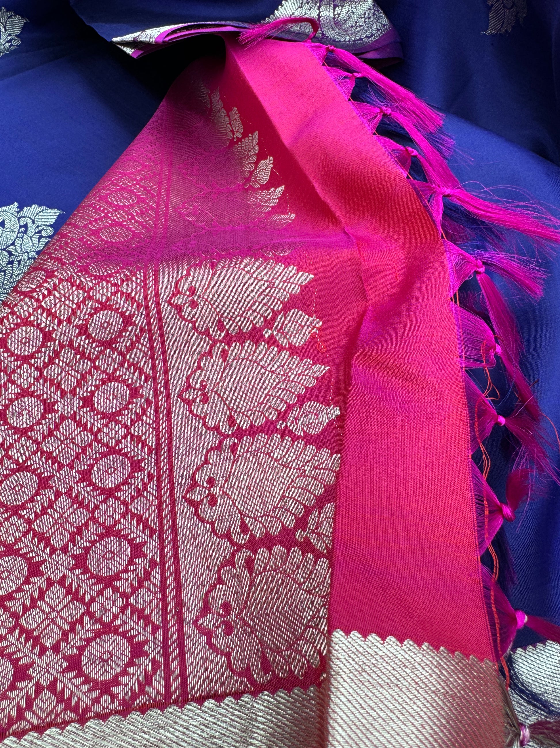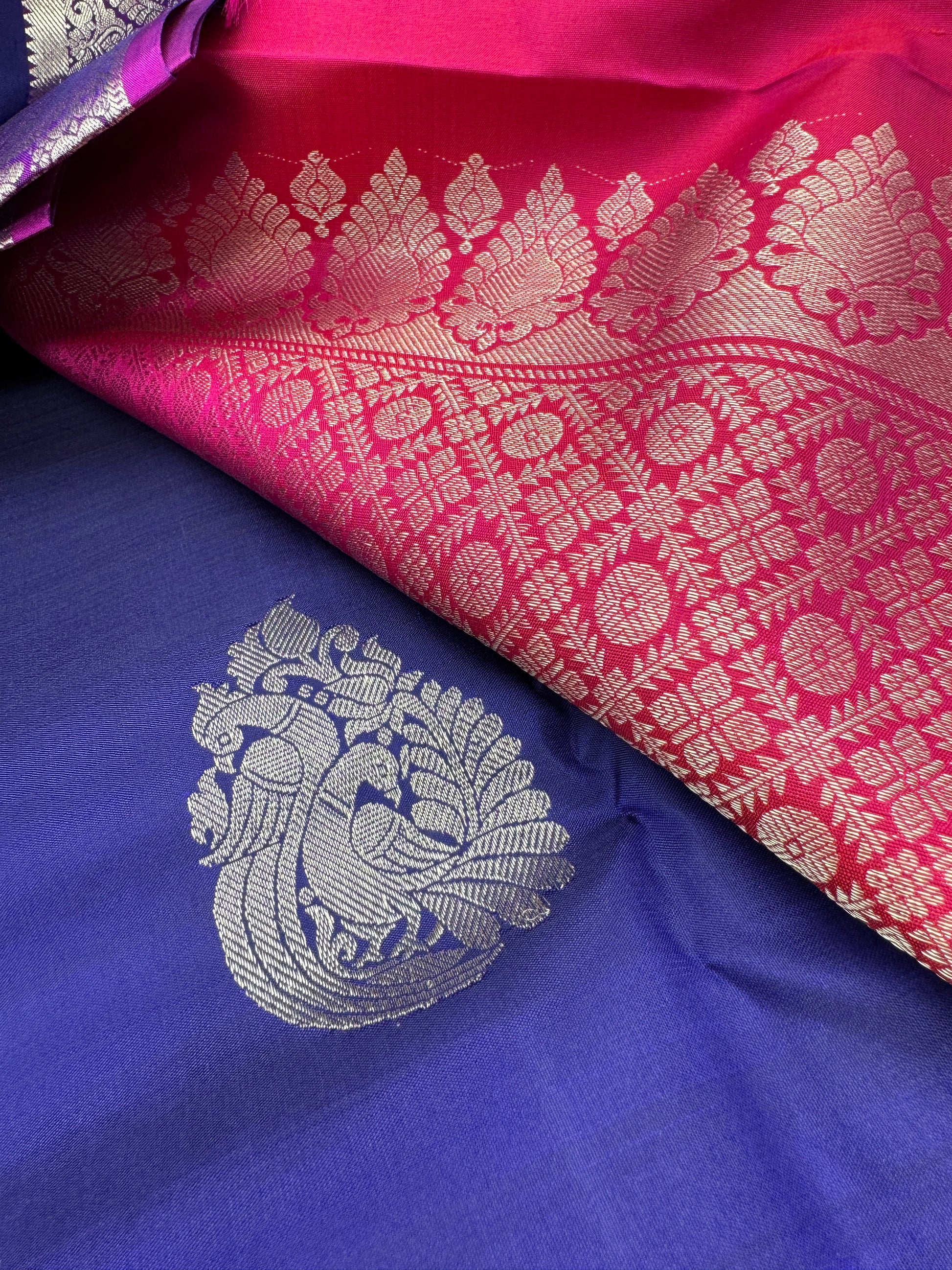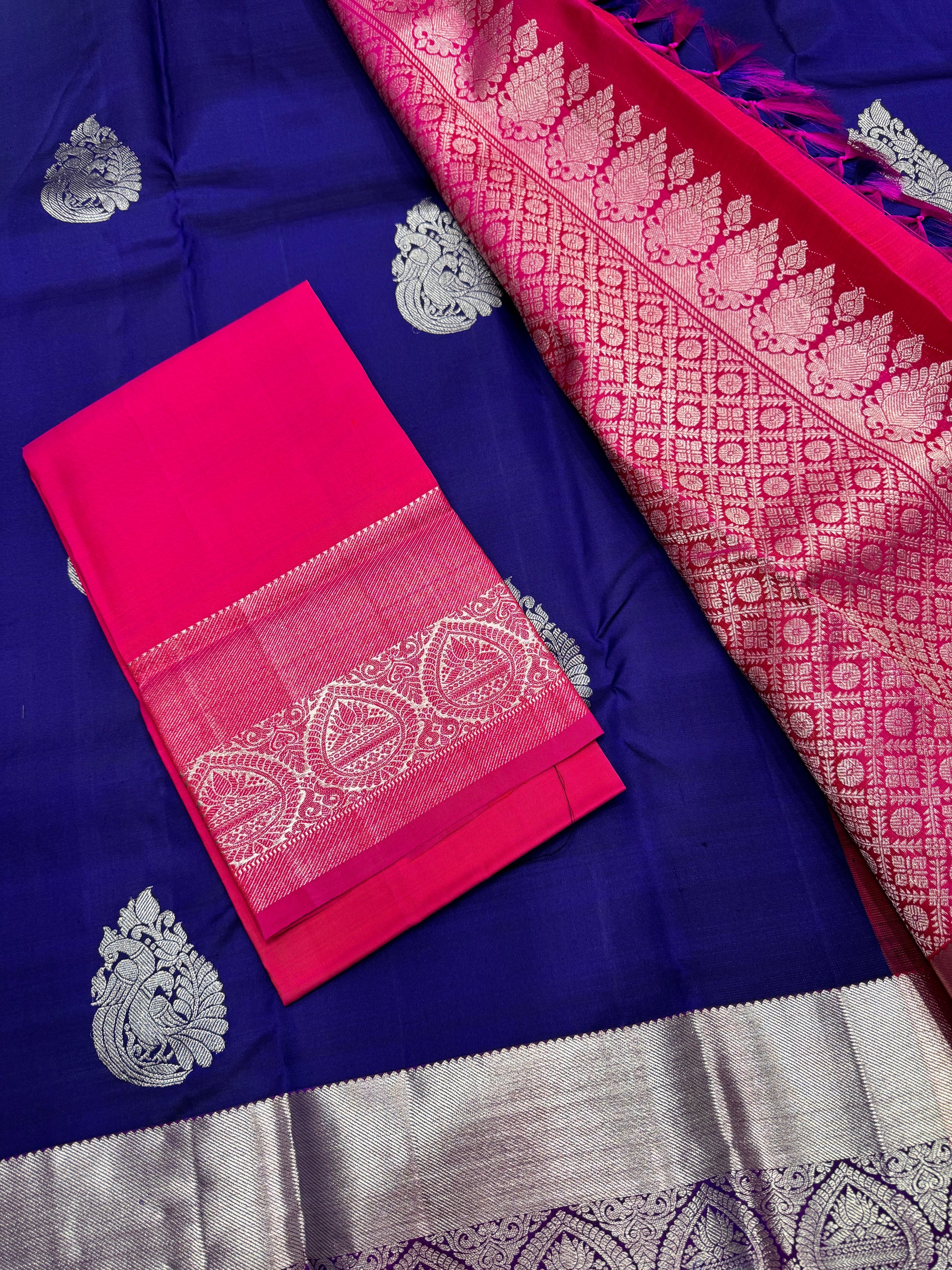 Indigo Kanchipuram Pure Silk Saree With Pink Contrast In Copper Zari