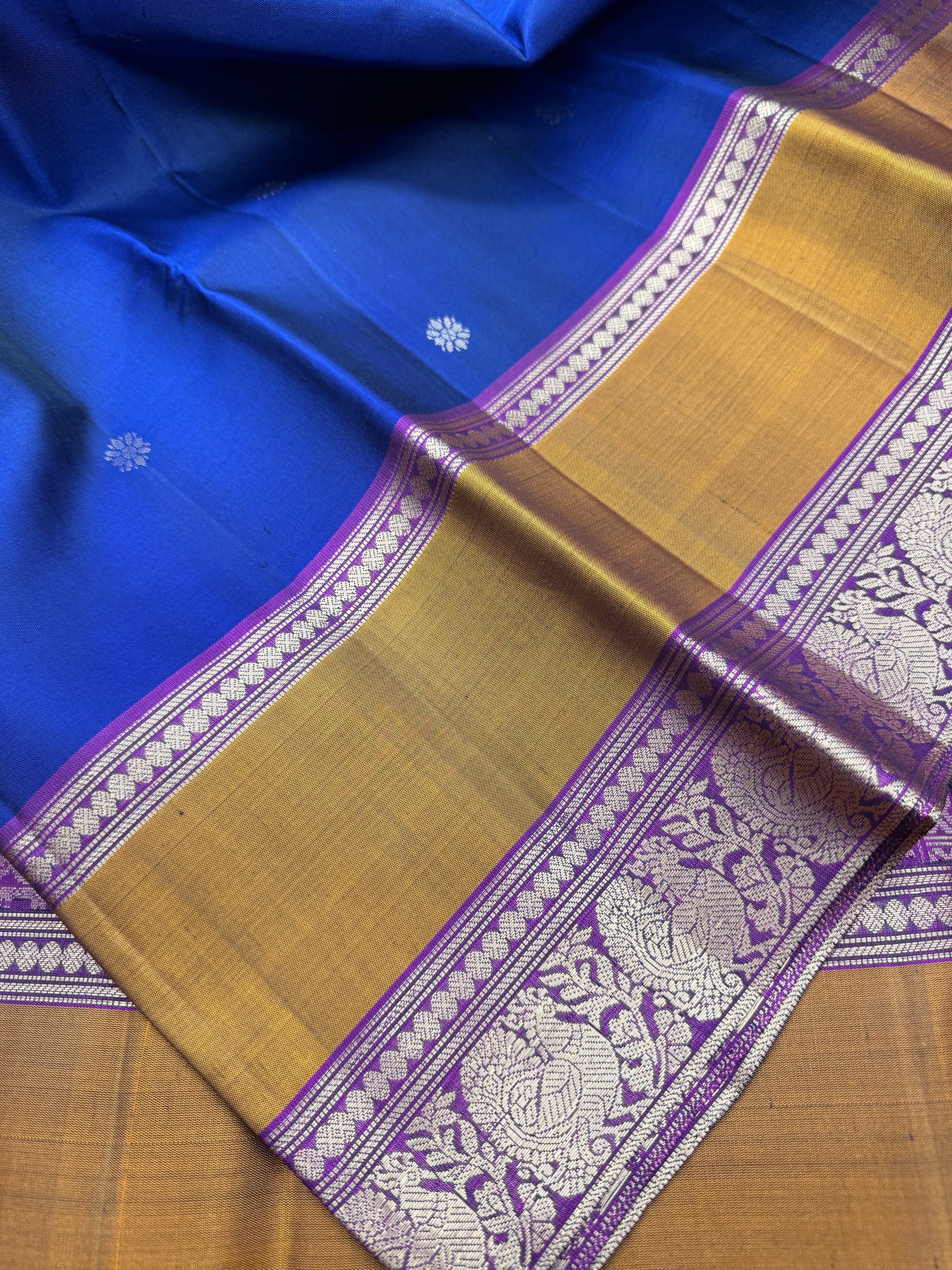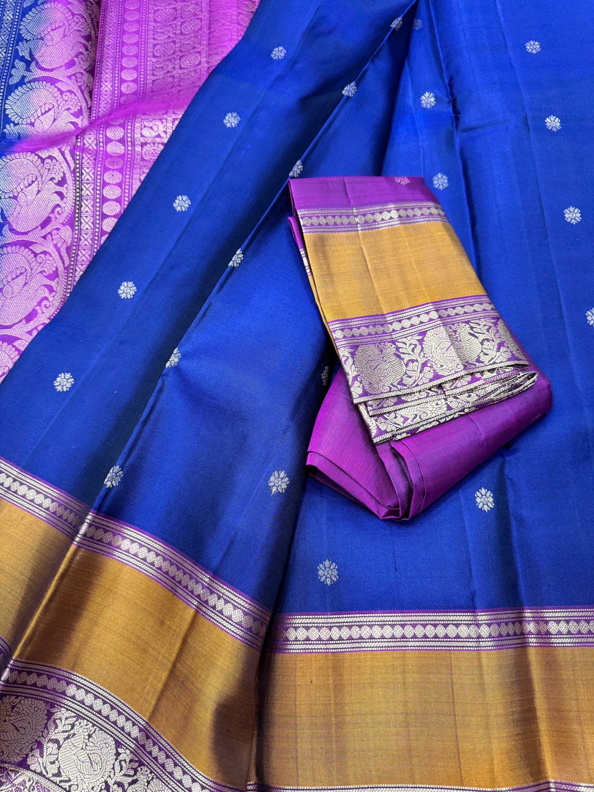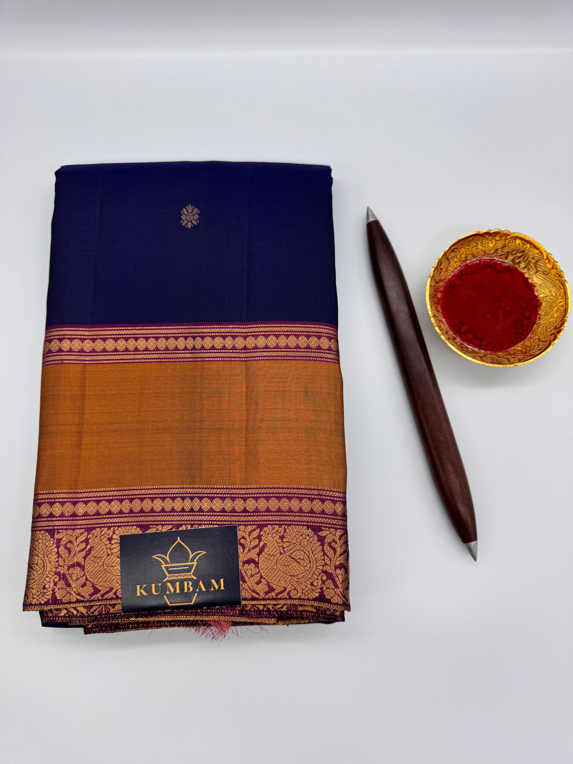 Discover the epitome of traditional elegance and craftsmanship with our Midnight Blue Kanchipuram Silk Saree, accentuated by a distinctive Retta Pettu border. This exquisite saree embodies the rich heritage of Kanchipuram weaves, known for their durability, luster, and intricate designs. Each saree is meticulously crafted by skilled artisans who dedicate numerous hours to weaving these masterpieces, ensuring that each piece tells a story of its own. The midnight blue hue, combined with the contrast of the Retta Pettu border, adds a touch of regal sophistication, making it a perfect choice for weddings, festivals, and special occasions.