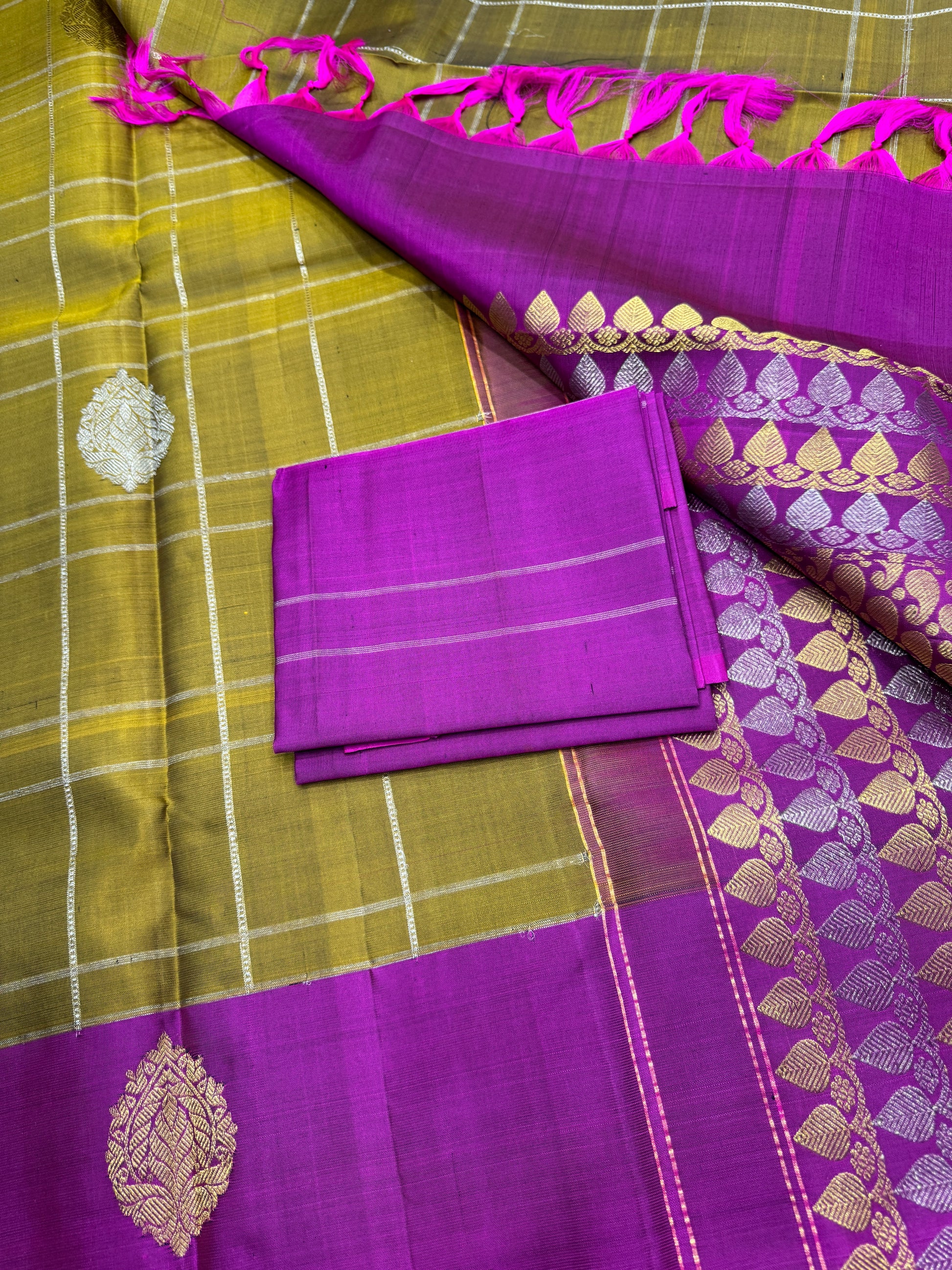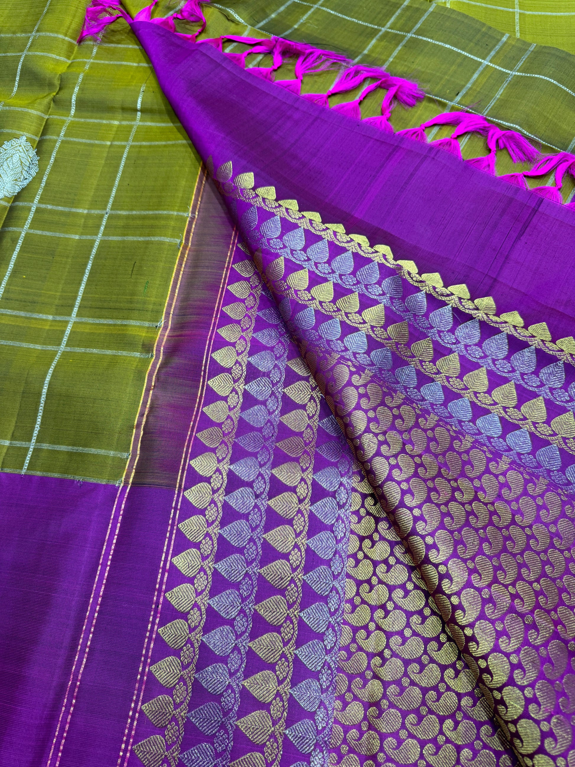 - Exquisite Gold and Silver Zari Work: Intricately woven zari adds a touch of royalty and magnificence, making the saree perfect for grand occasions.
