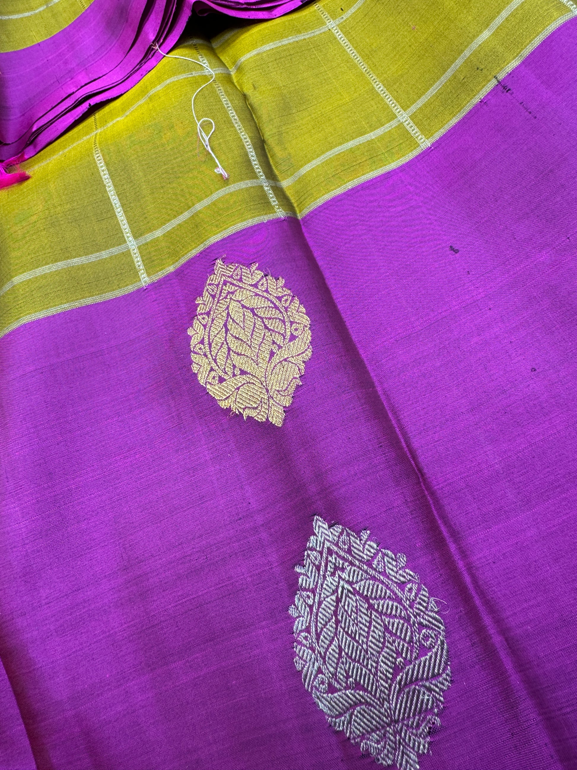 Discover the epitome of grace and tradition with our Pear Green and Purple Kanchipuram Borderless Pure Silk Saree, meticulously crafted to elevate your wardrobe. This exquisite saree embodies the rich heritage of Kanchipuram weaves, renowned for their durability, luster, and intricate designs. The saree features a unique blend of pear green and purple hues, beautifully accentuated by the lustrous gold and silver zari work, making it a masterpiece of craftsmanship and style.