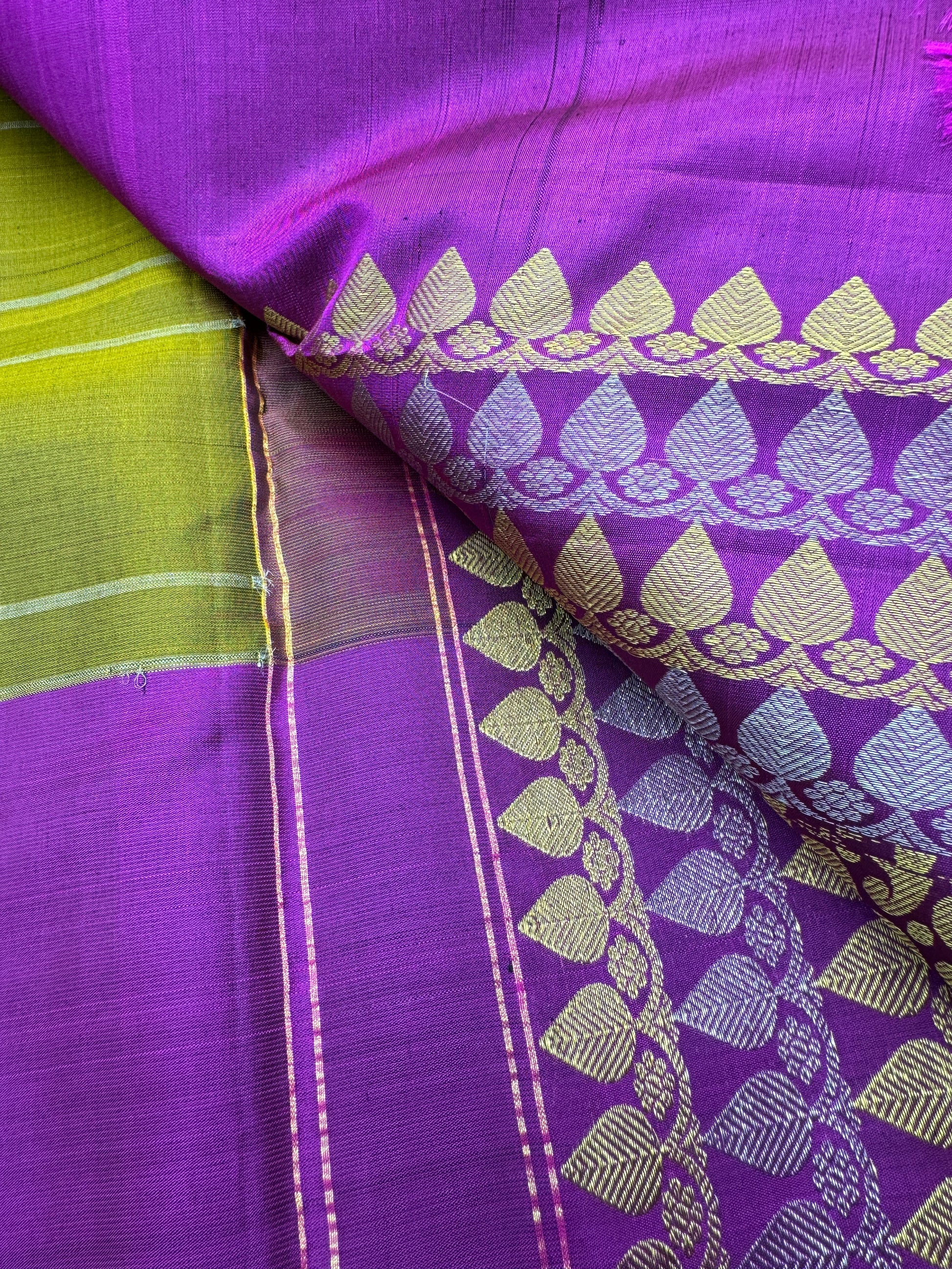 Pear Green And Purple Kanchipuram Borderless Pure Silk Saree in Gold and Silver Zari