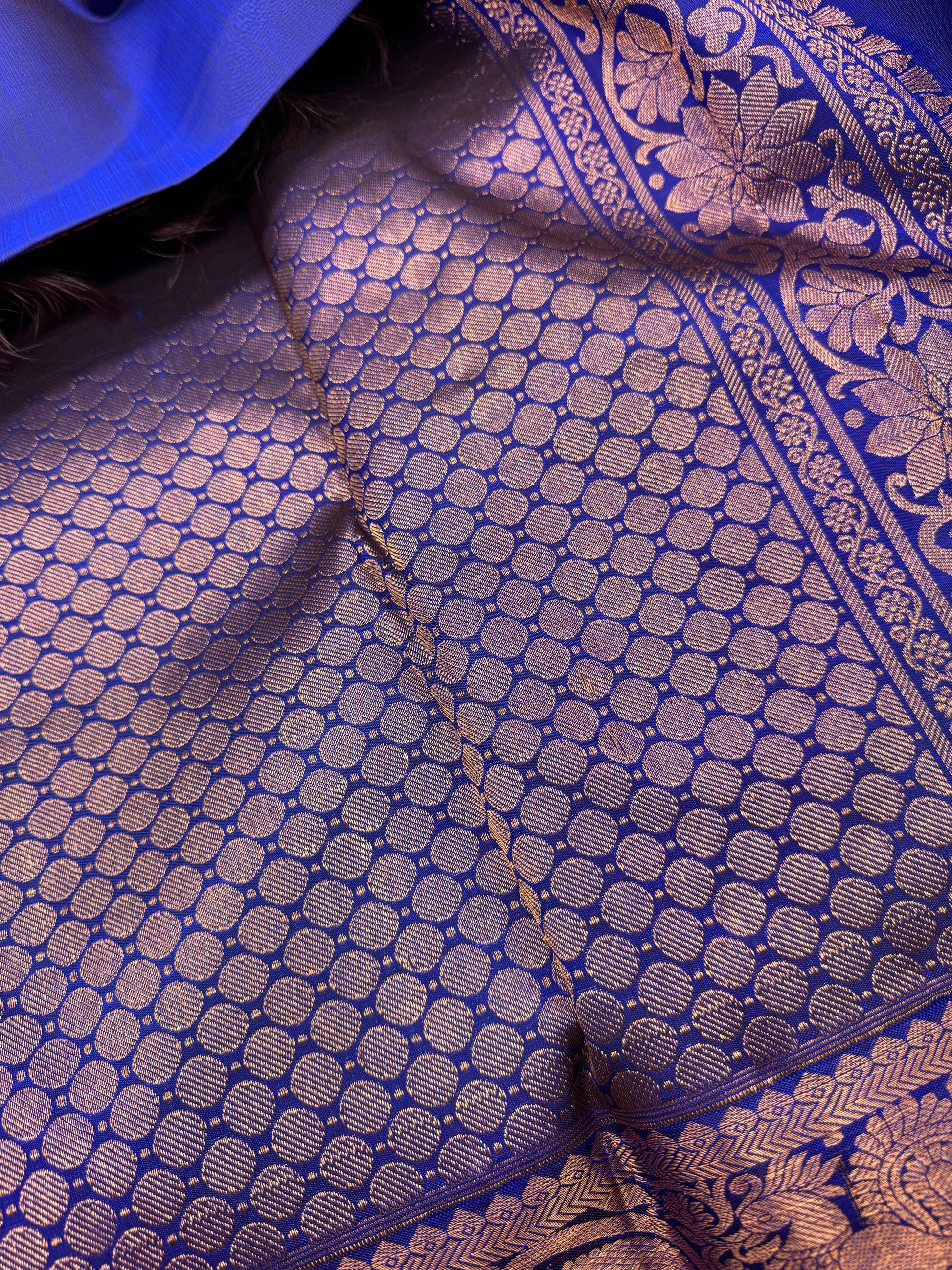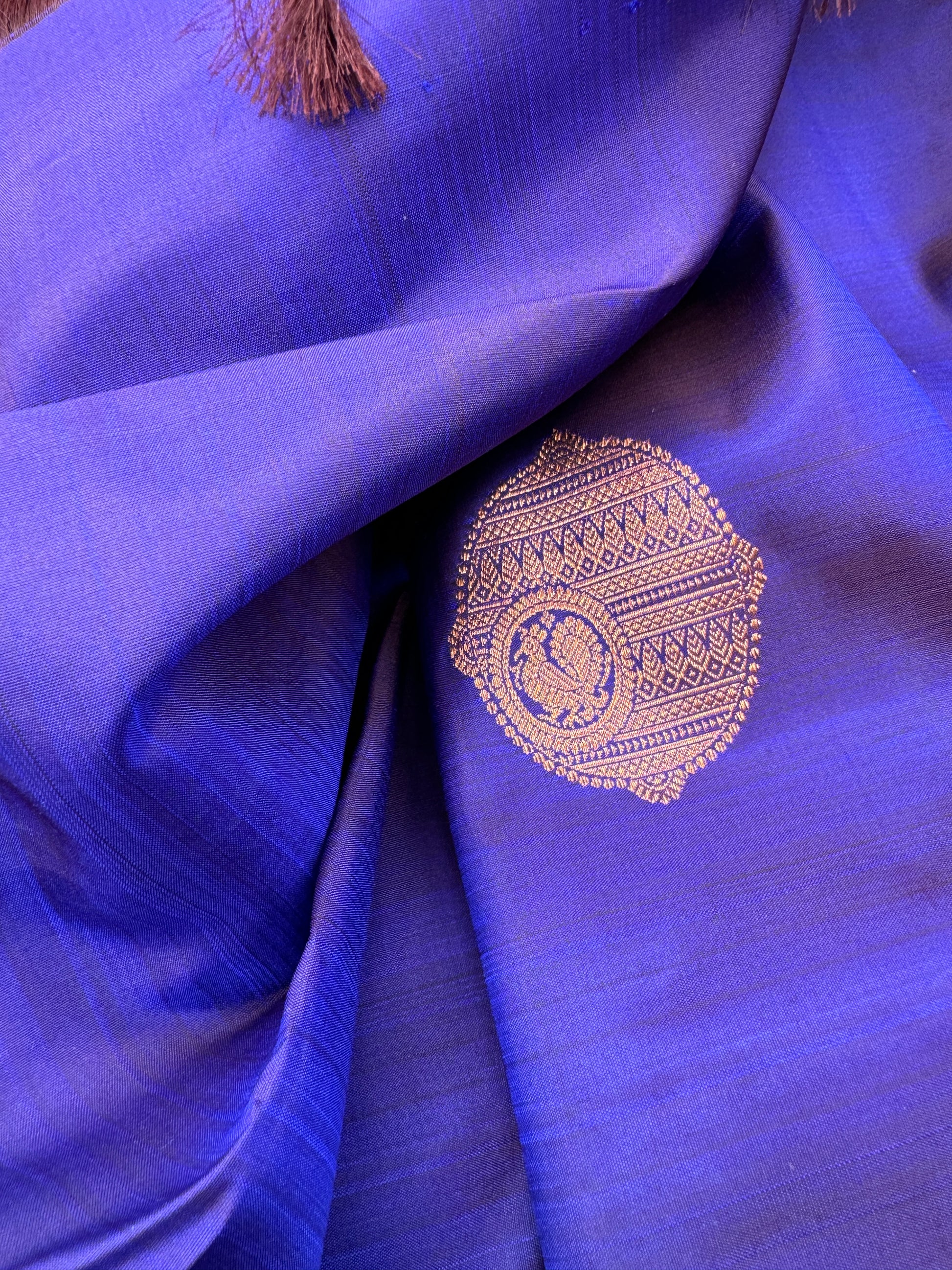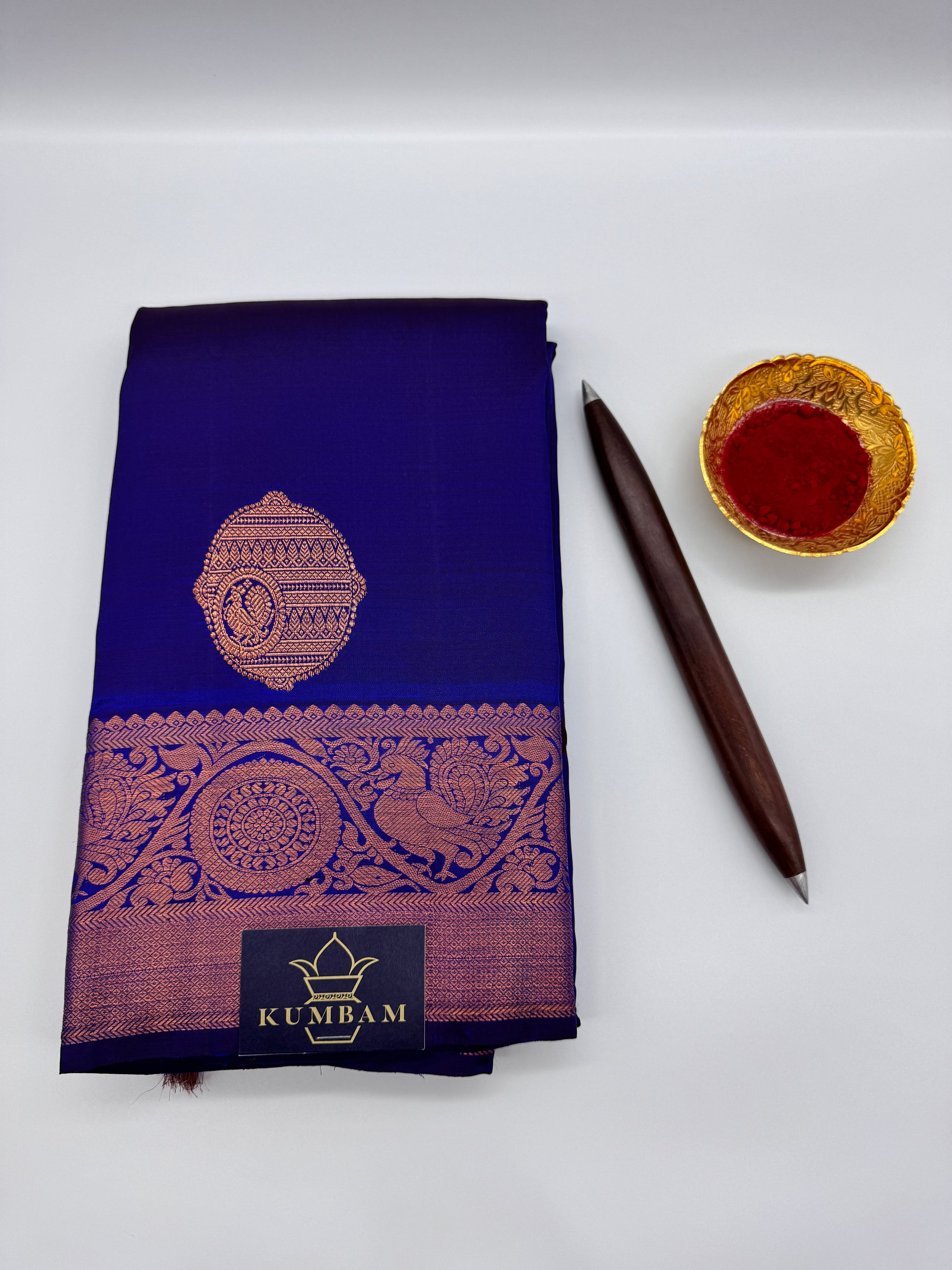 Crafted from premium quality silk, this saree boasts a rich texture and a luxurious feel against the skin. The royal blue hue symbolizes depth and stability, exuding an aura of sophistication and grace. Adorned with copper zari, the saree reflects a perfect blend of tradition and contemporary elegance, making it suitable for a wide range of occasions, from weddings to formal gatherings.