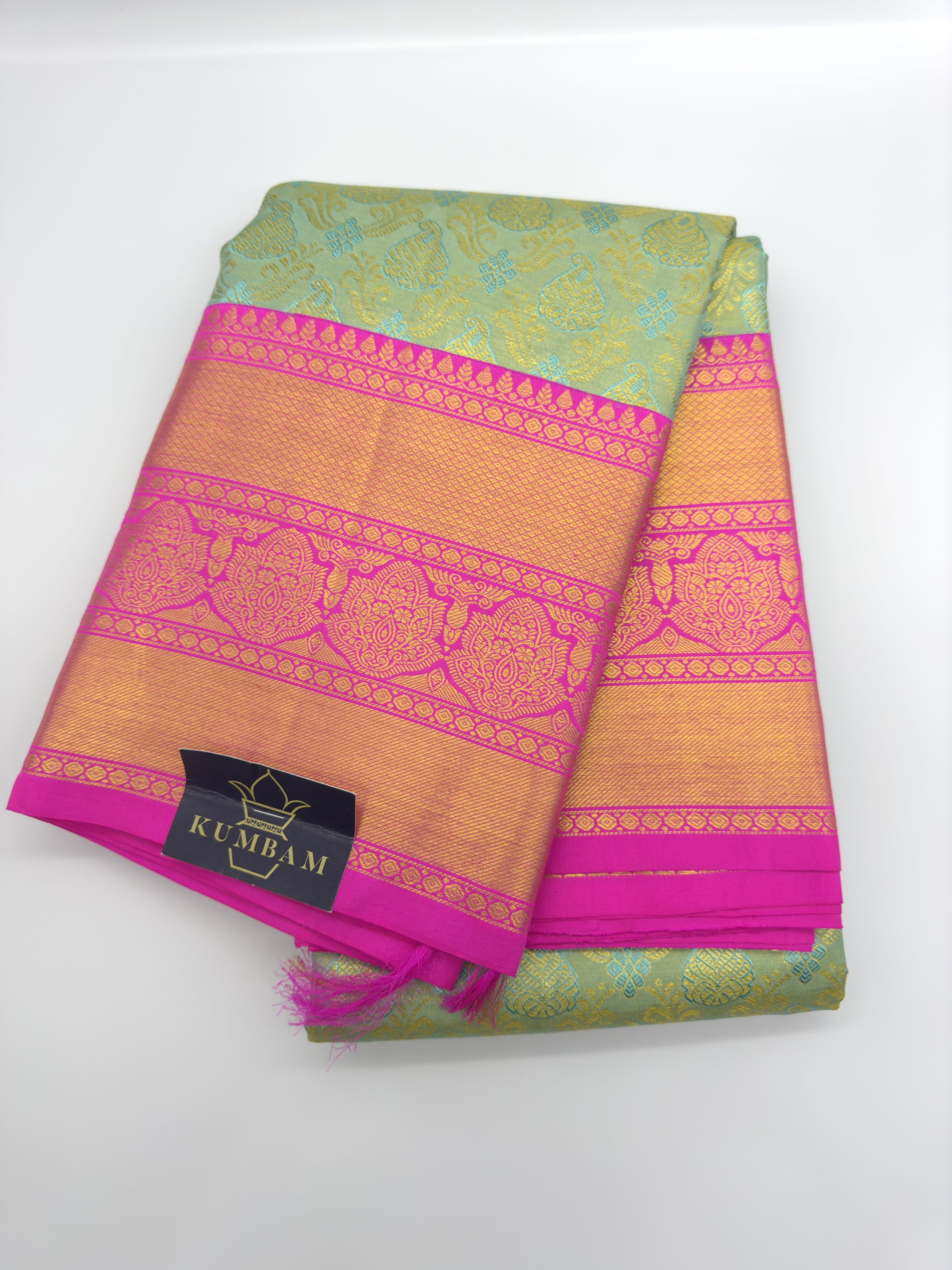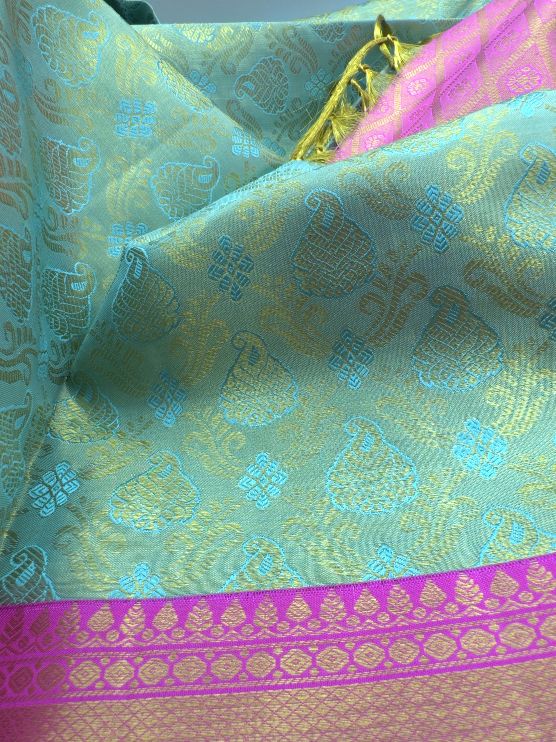 Seafoam Green Pure Tissue Silk With Hot Pink Border and Pallu In Gold Zari