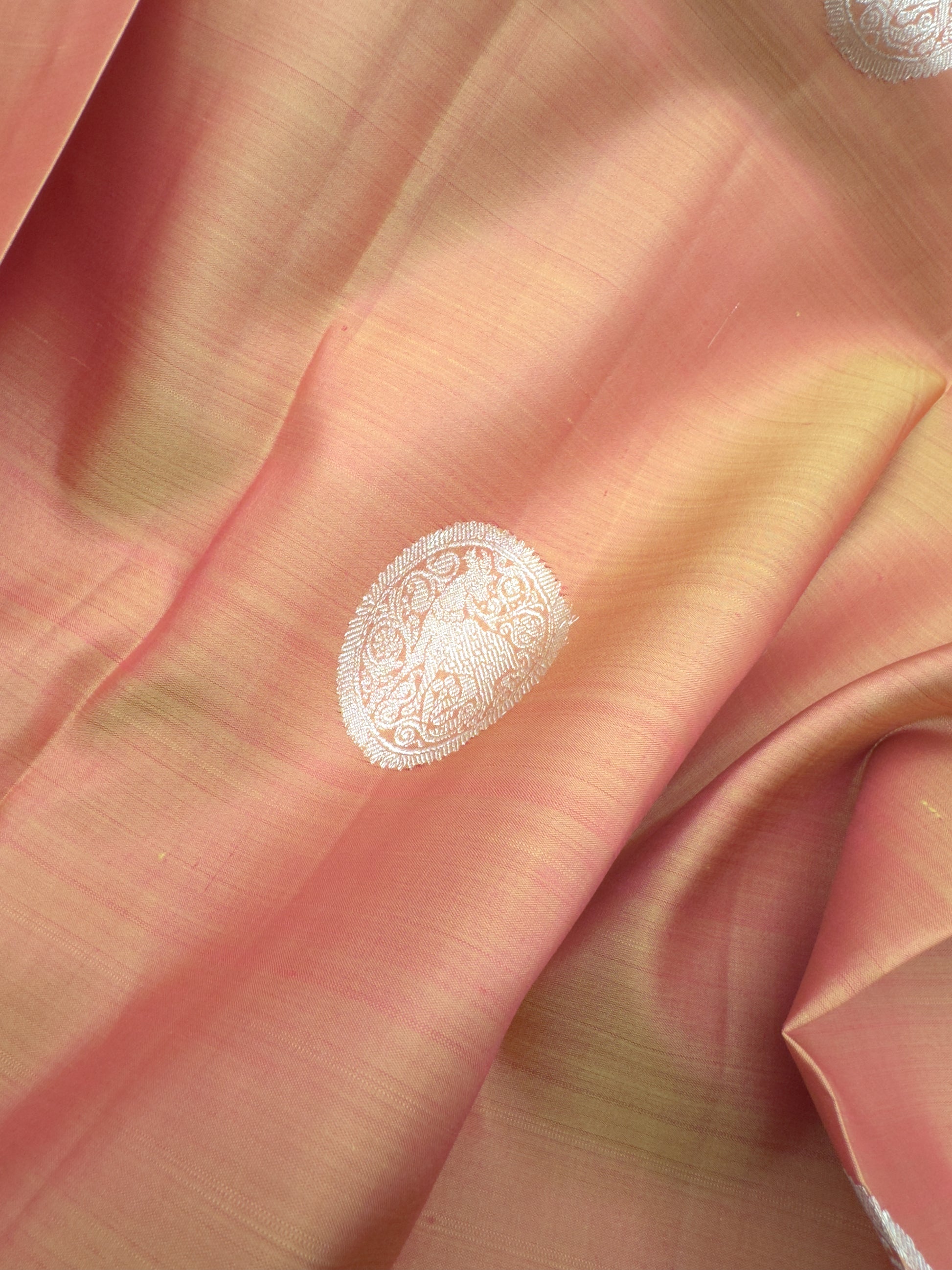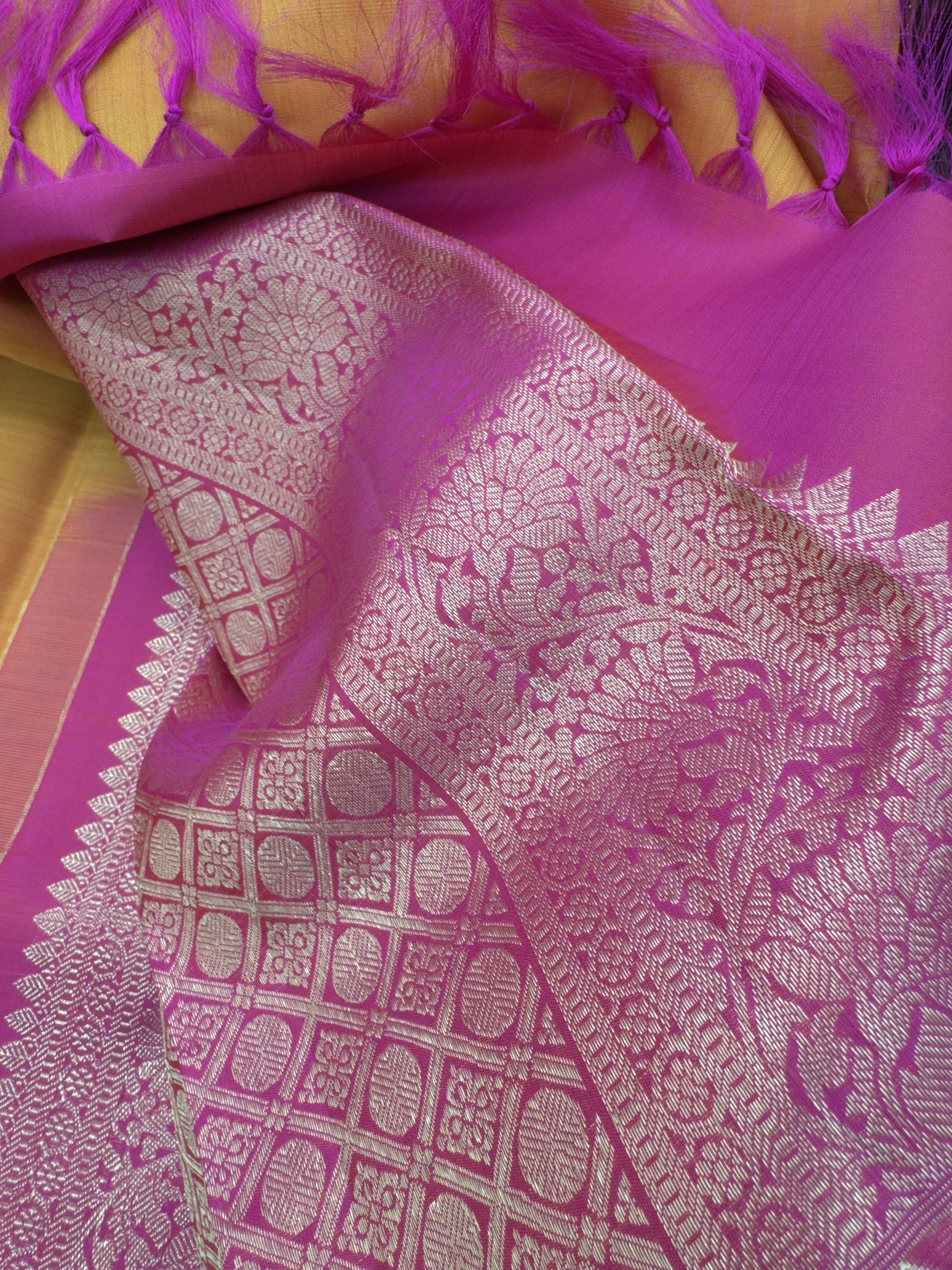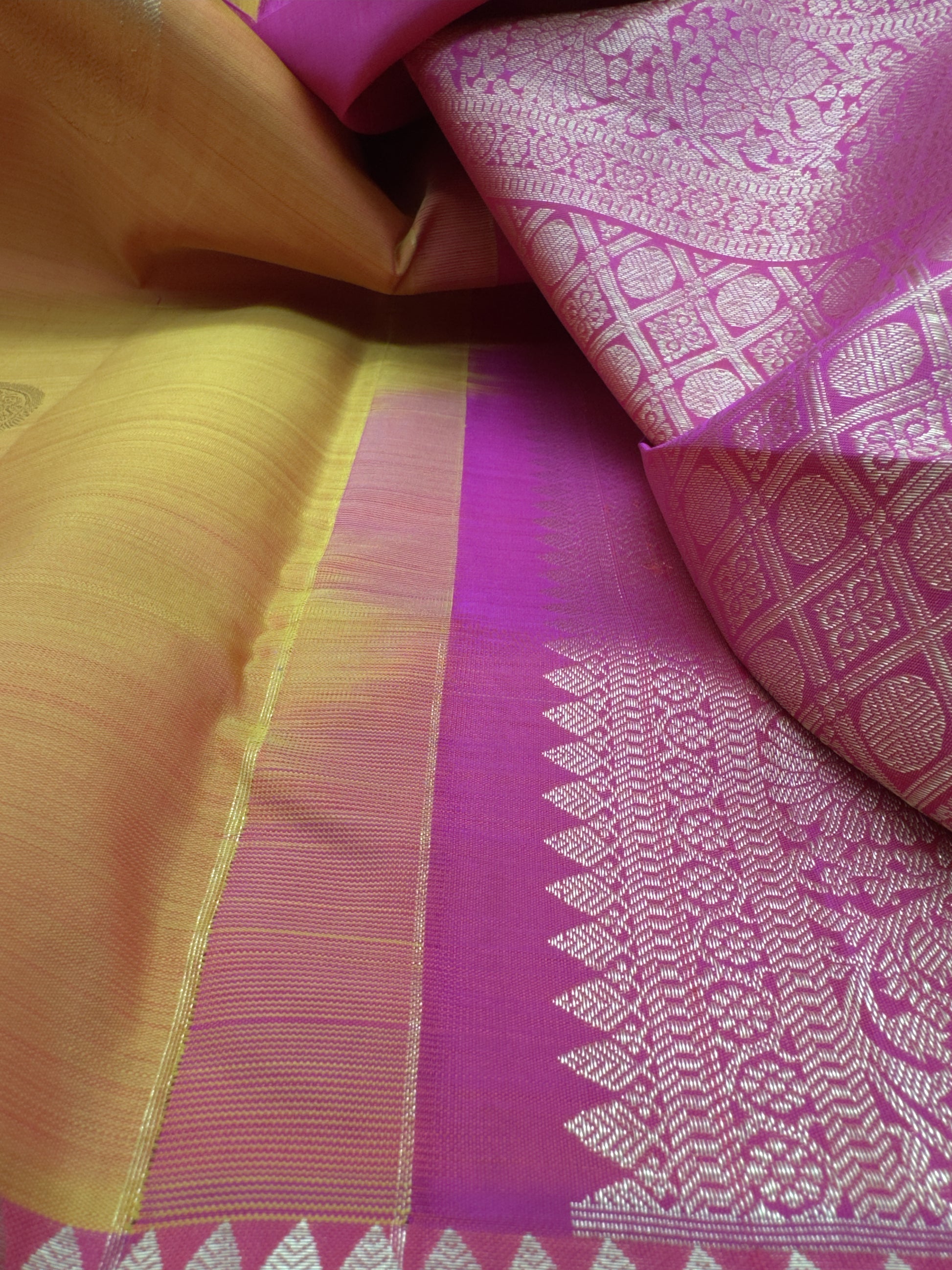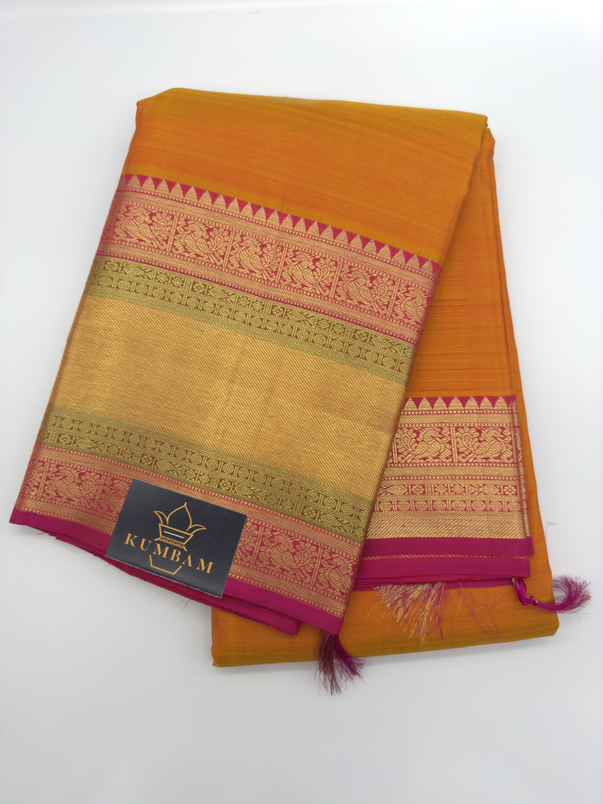 Discover the epitome of traditional elegance with our Sunset Kanchipuram Silk Saree, a masterpiece designed for the discerning woman. This saree embodies grace and sophistication, making it a perfect choice for weddings, festivals, and special occasions. The rich, sunset-hued silk fabric exudes a warm glow, mirroring the captivating beauty of the evening sky. The highlight of this saree is its contrast pink pallu, meticulously crafted with gold zari work that adds a touch of opulence and glamour.
