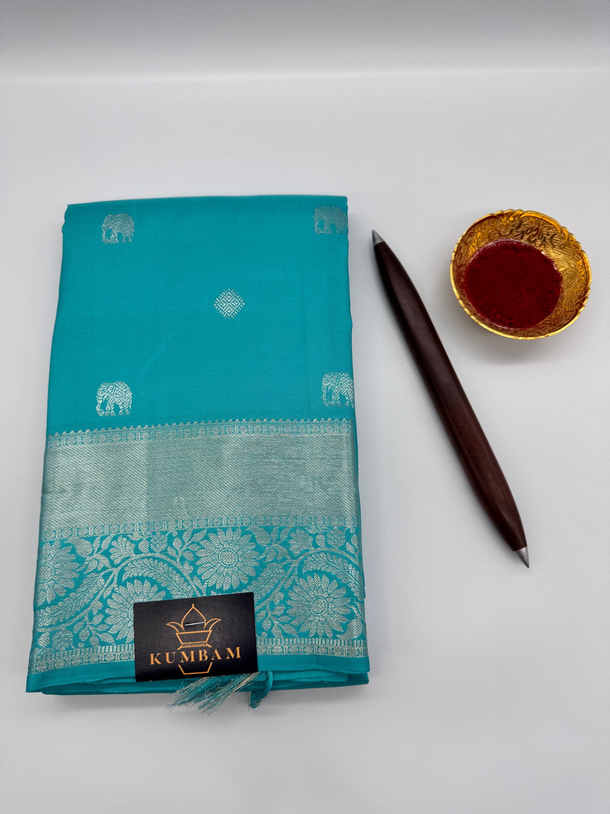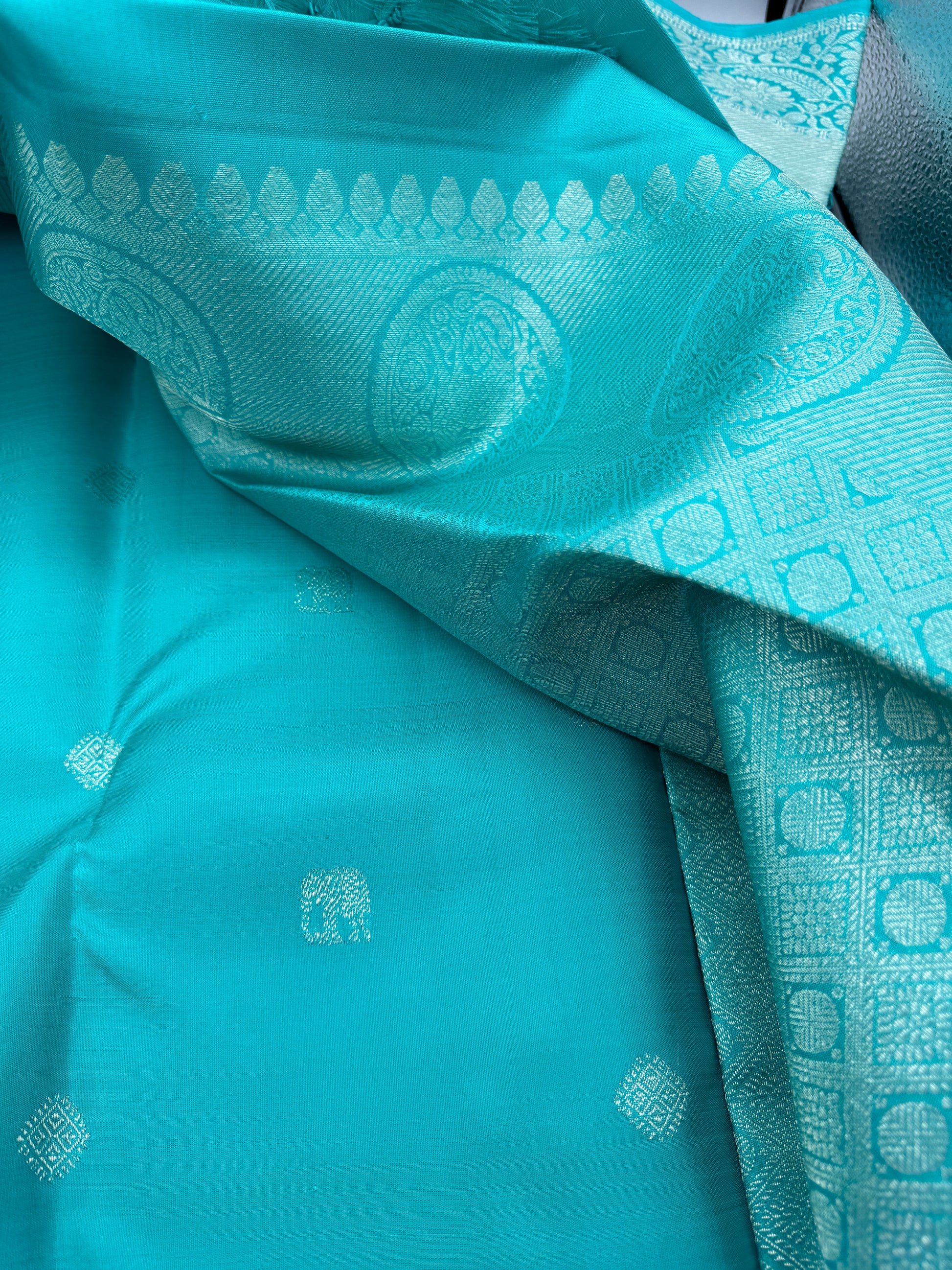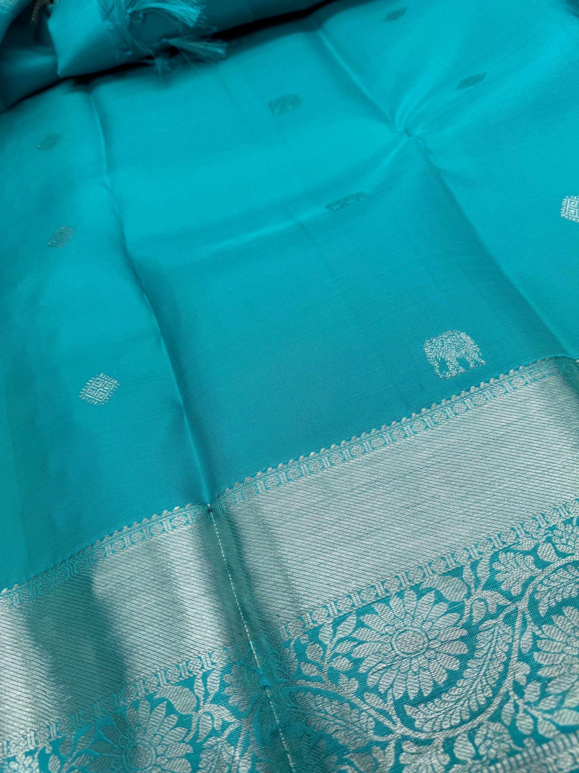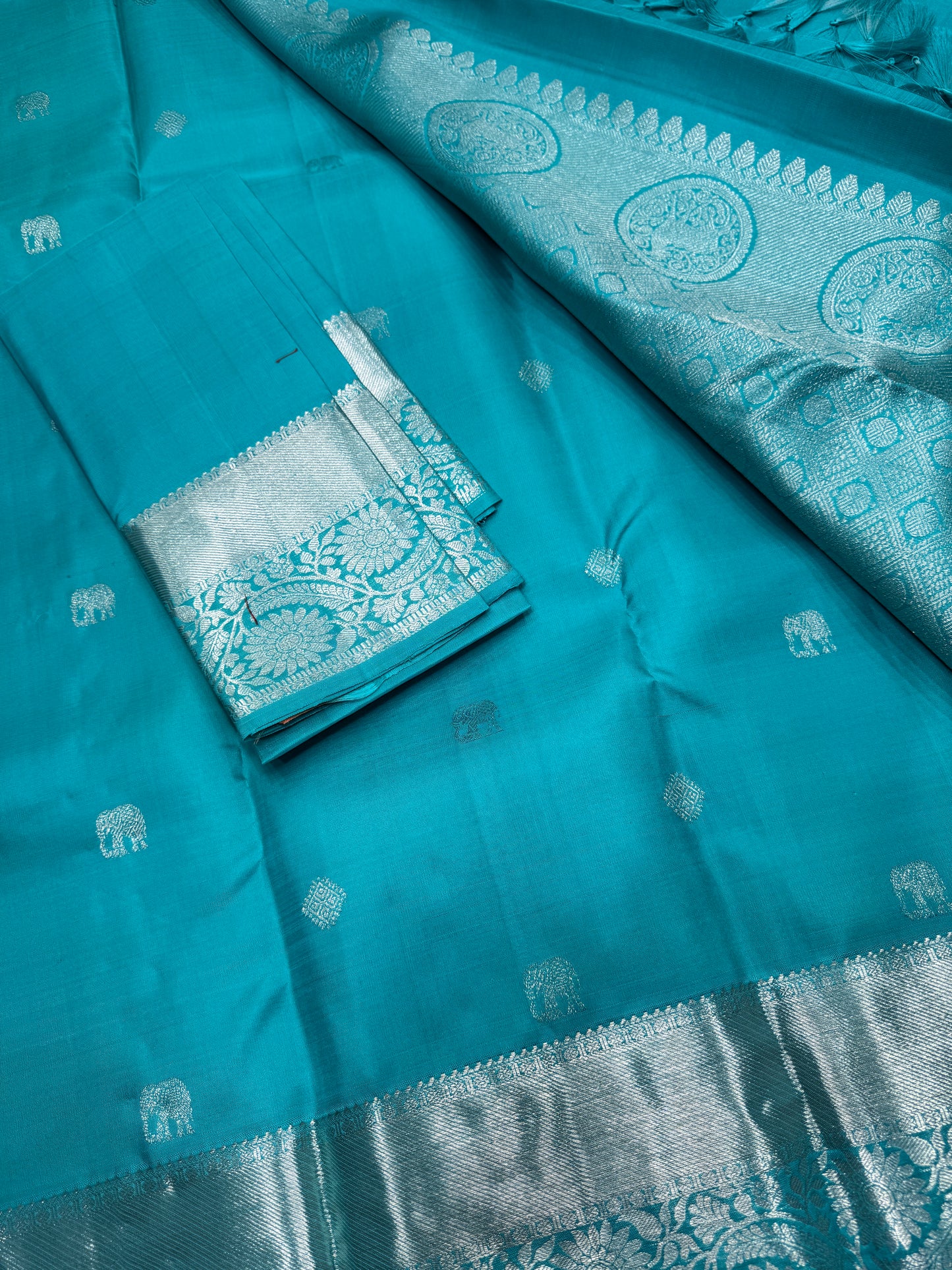 Immerse yourself in the exquisite beauty of traditional Indian craftsmanship with our Elegant Turquoise Kanchipuram Silk Saree, adorned with mesmerizing Silver Zari Work. This saree represents the pinnacle of ethnic elegance, perfect for weddings, festivals, and special occasions. Crafted from the finest Kanchipuram silk, known for its durability and luster, this saree showcases a vibrant turquoise hue that symbolizes calmness and sophistication. The silver zari work intricately woven into the fabric adds a touch of regality, making it a timeless piece for your wardrobe.